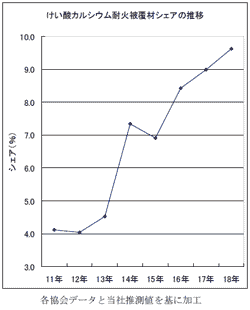 鉄骨耐火被覆の分野でも,耐火品質の確保,粉じんなど環境・健康の問題からけい酸カルシウム耐火被覆板「ニュータイカライト」をはじめとする乾式工法が急激に伸びています。