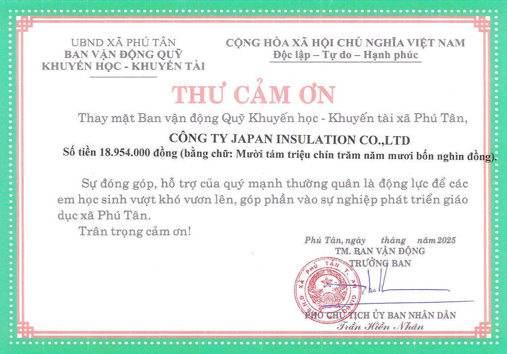 日本インシュレーション株式会社(以下JIC)は、2025年9月5日に完全子会社ジェイ アイ シー ベトナム有限会社(英語社名:JIC VIETNAM ONE MEMBER COMPANY LIMITED./以下JICV)の地元であるベトナム社会主義共和国アンザン省フータン村※の小学校・中学校へ通う貧困家庭生徒30名へ健康保険の支援を行いました。
